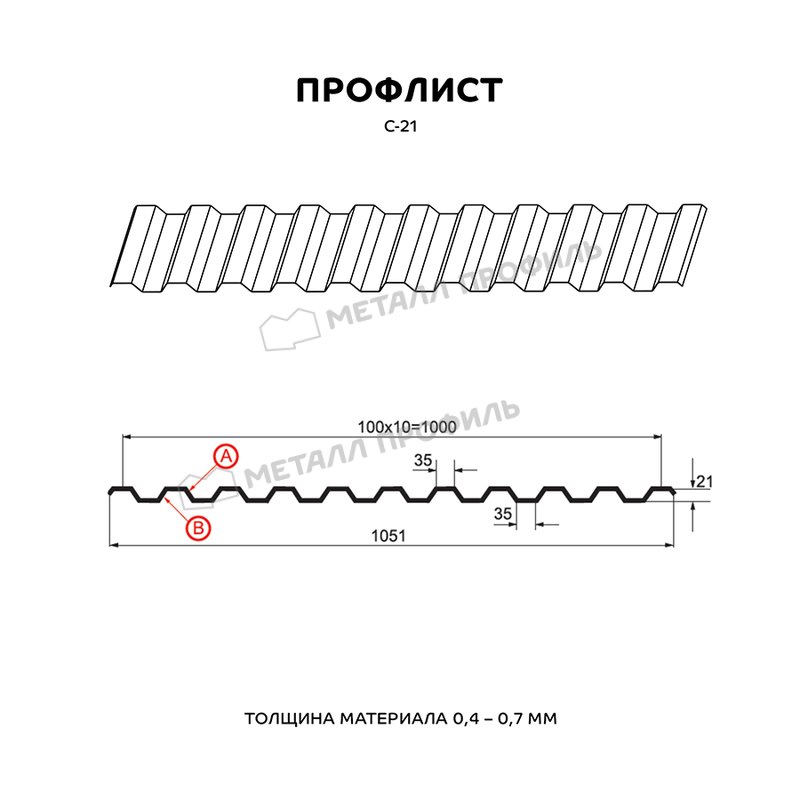 Профлист имеет форму С-21, которая обеспечивает прочность и устойчивость к нагрузкам. Он легко монтируется и обладает высокой степенью защиты от влаги и коррозии.